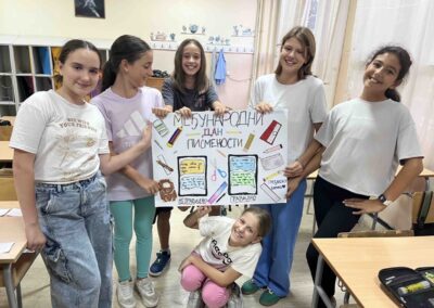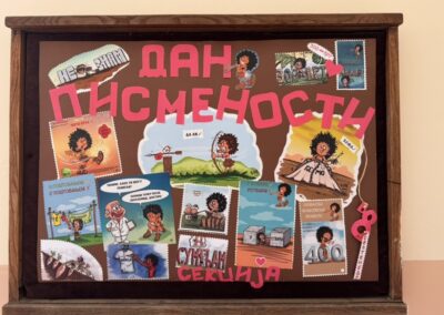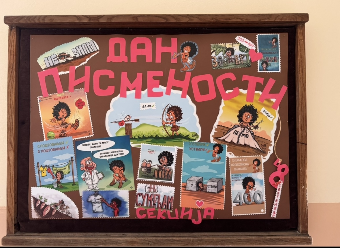 Међународни дан писмености обележен је и у нашој школи радионицом и израдом паноа у школској библиотеци, као и на часовома грађанског васпитања са ученицима петог разреда. Пано смо сачинили од илустрација Бојана Јокановића и његовог лика Сизифа.