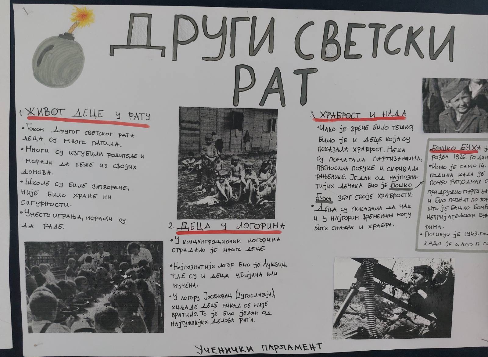 Чланови Ученичког парламента 7/1 разреда су урадили пано да би све подсетили на страхоте рата, где и деца страдају. Такође, мир треба чувати и уживати у њему.