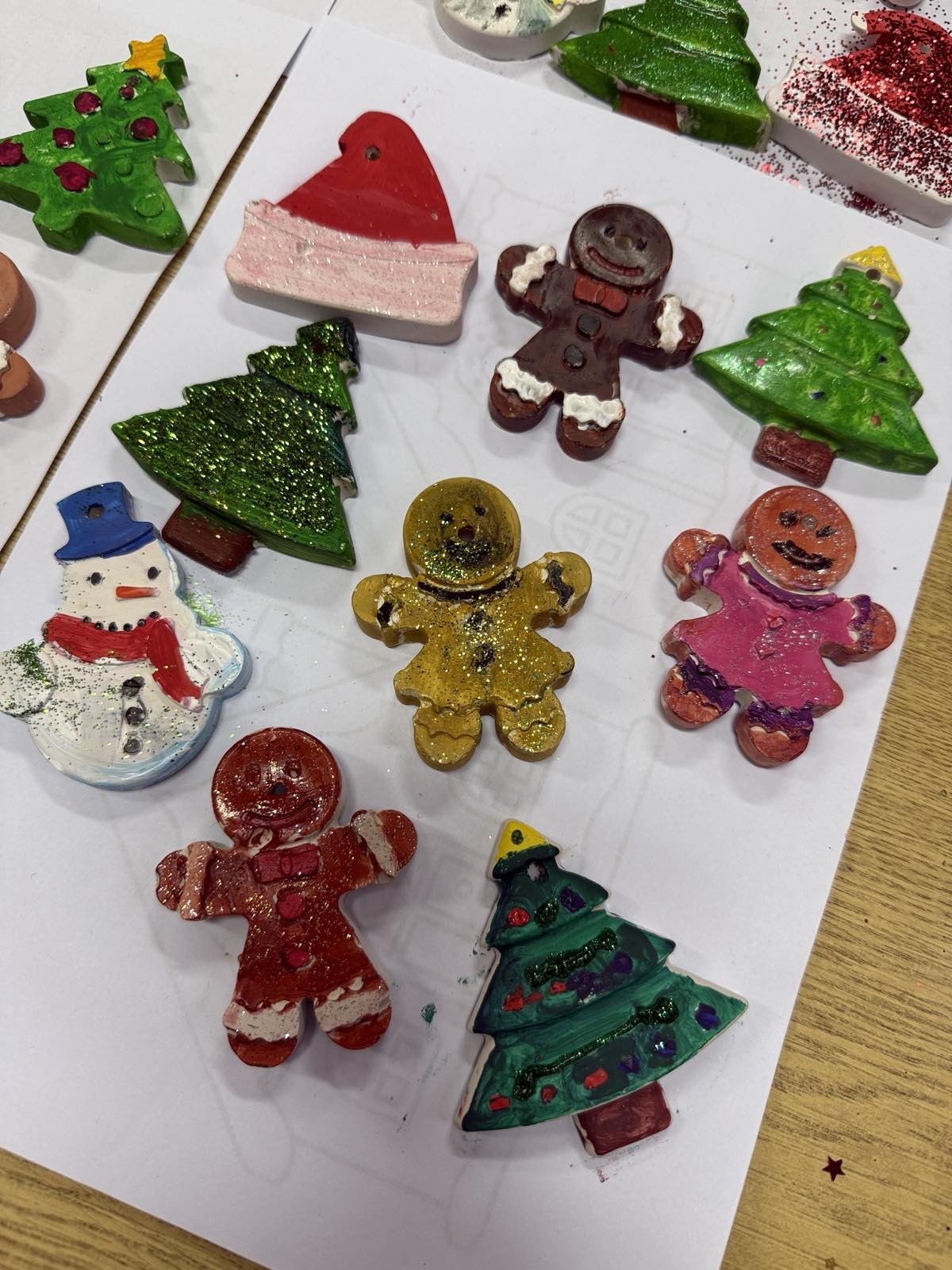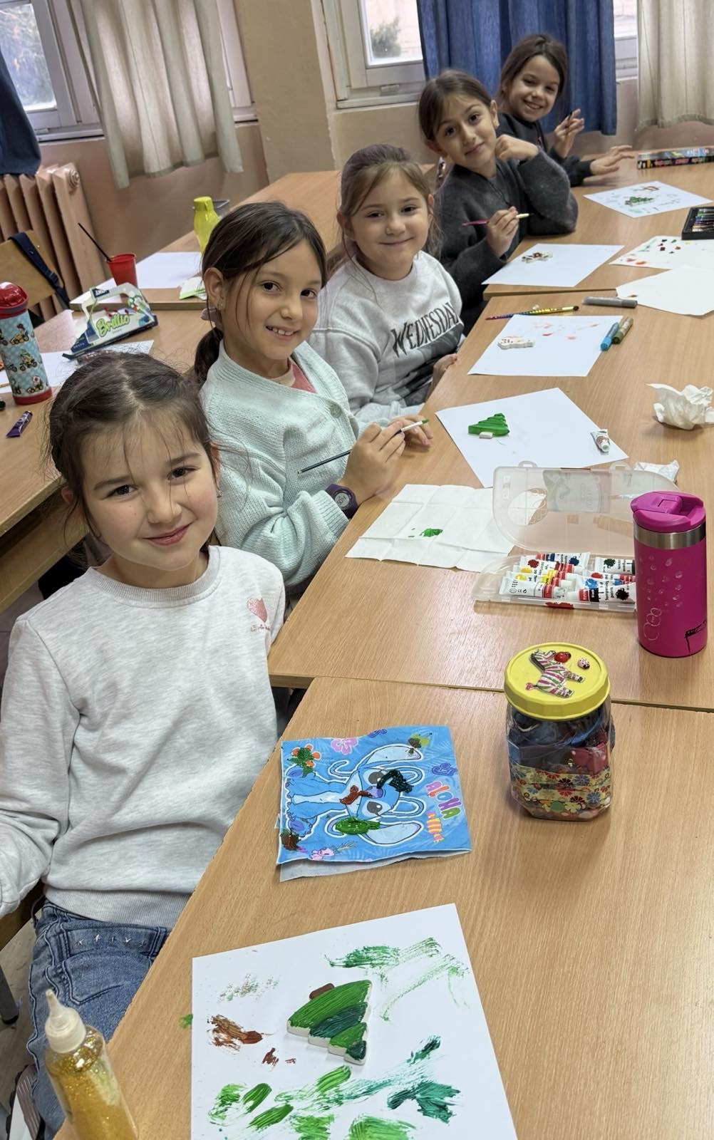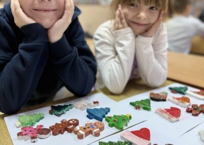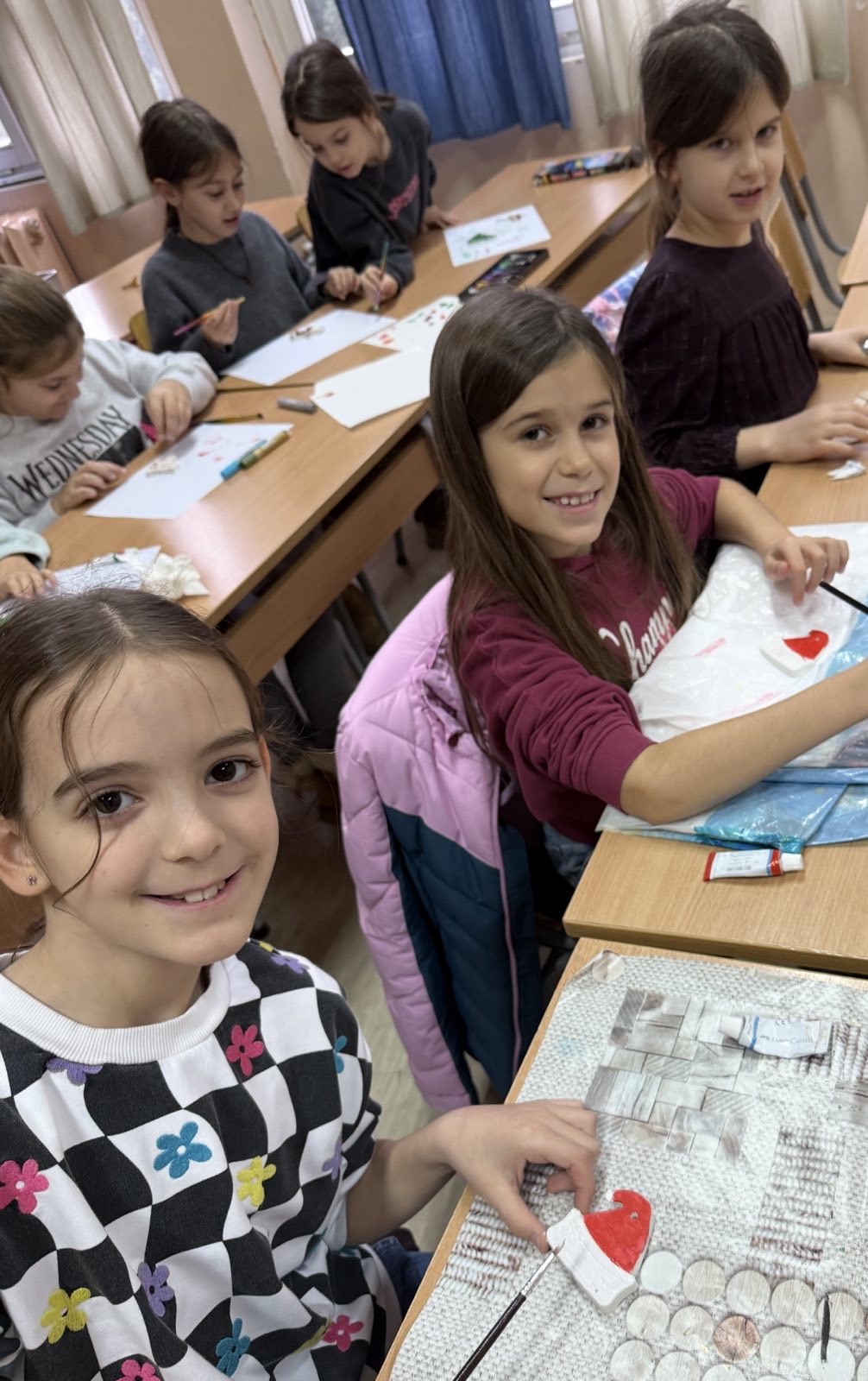 У претпразничном расположењу, ученици одељења 2/5 данас су у продуженом боравку стварали новогодишње фигуре од гипса. Са радошћу су их осликавали и претварали у уникатне украсе за јелку.