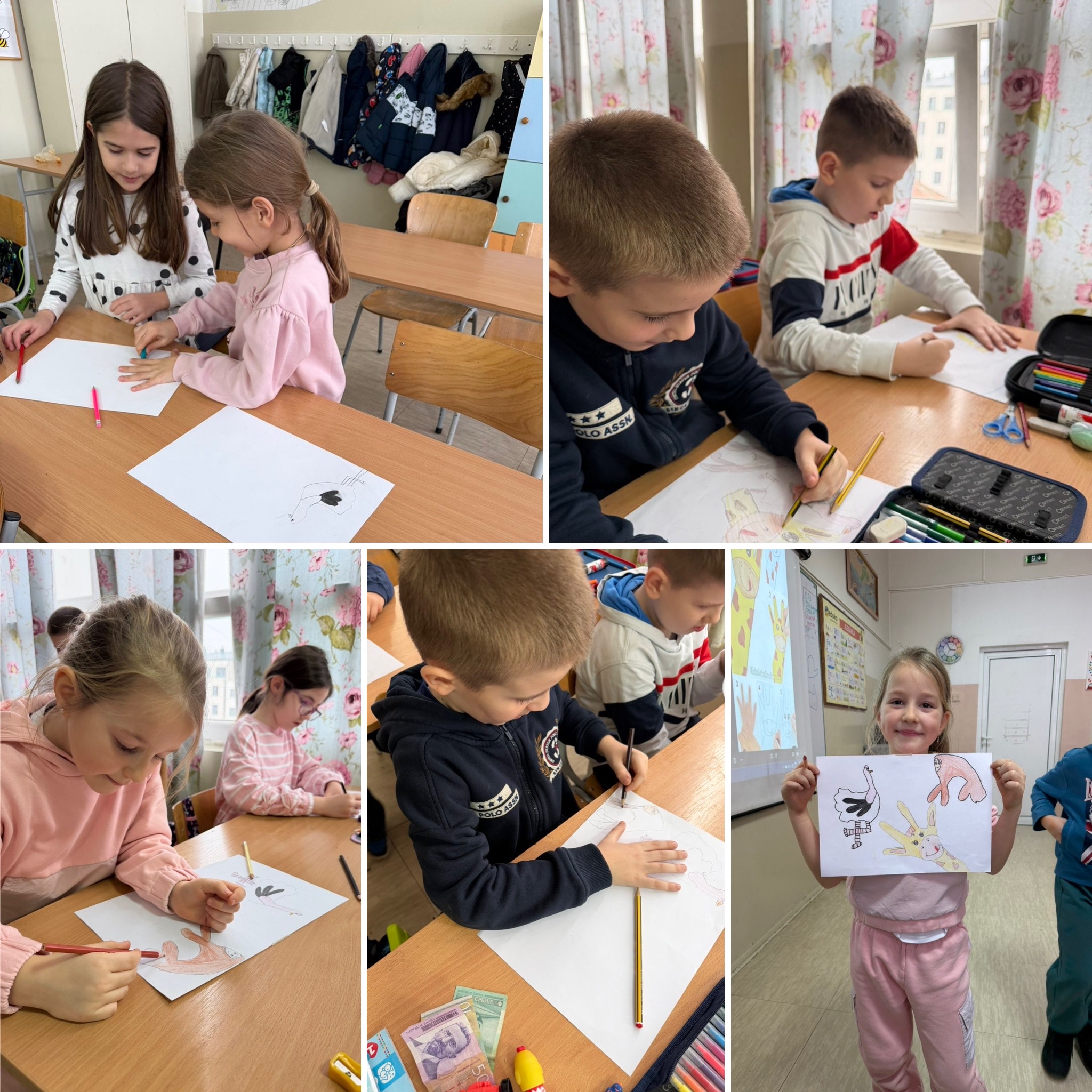 Током радионице, уз помоћ својих руку, цртали су животиње из природе. Посматрајући фотографије приказане на пројектору, бирали су положај шаке и прстију како би што верније приказали изабрану животињу. Кроз игру, машту и стваралаштво, ученици су развијали креативност и уживали у процесу рада. Са великим узбуђењем ишчекивали су завршетак својих цртежа и поносно представили своје јединствене радове.