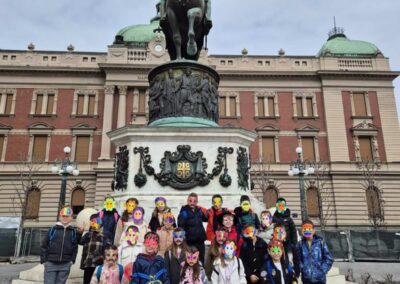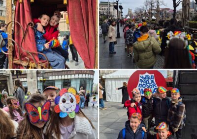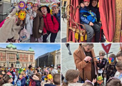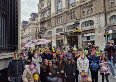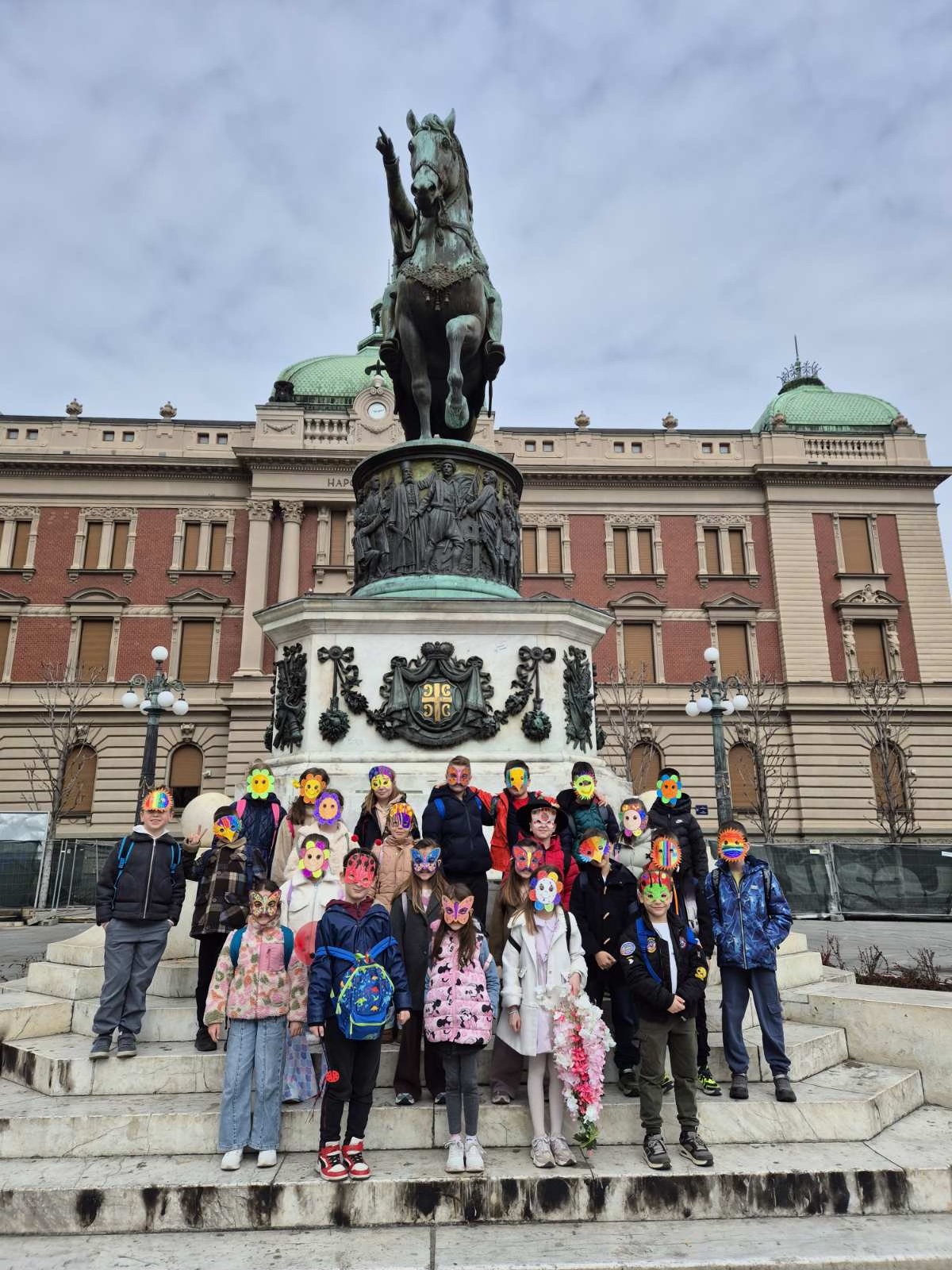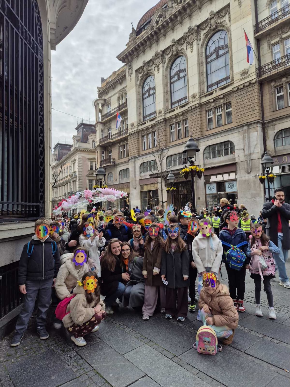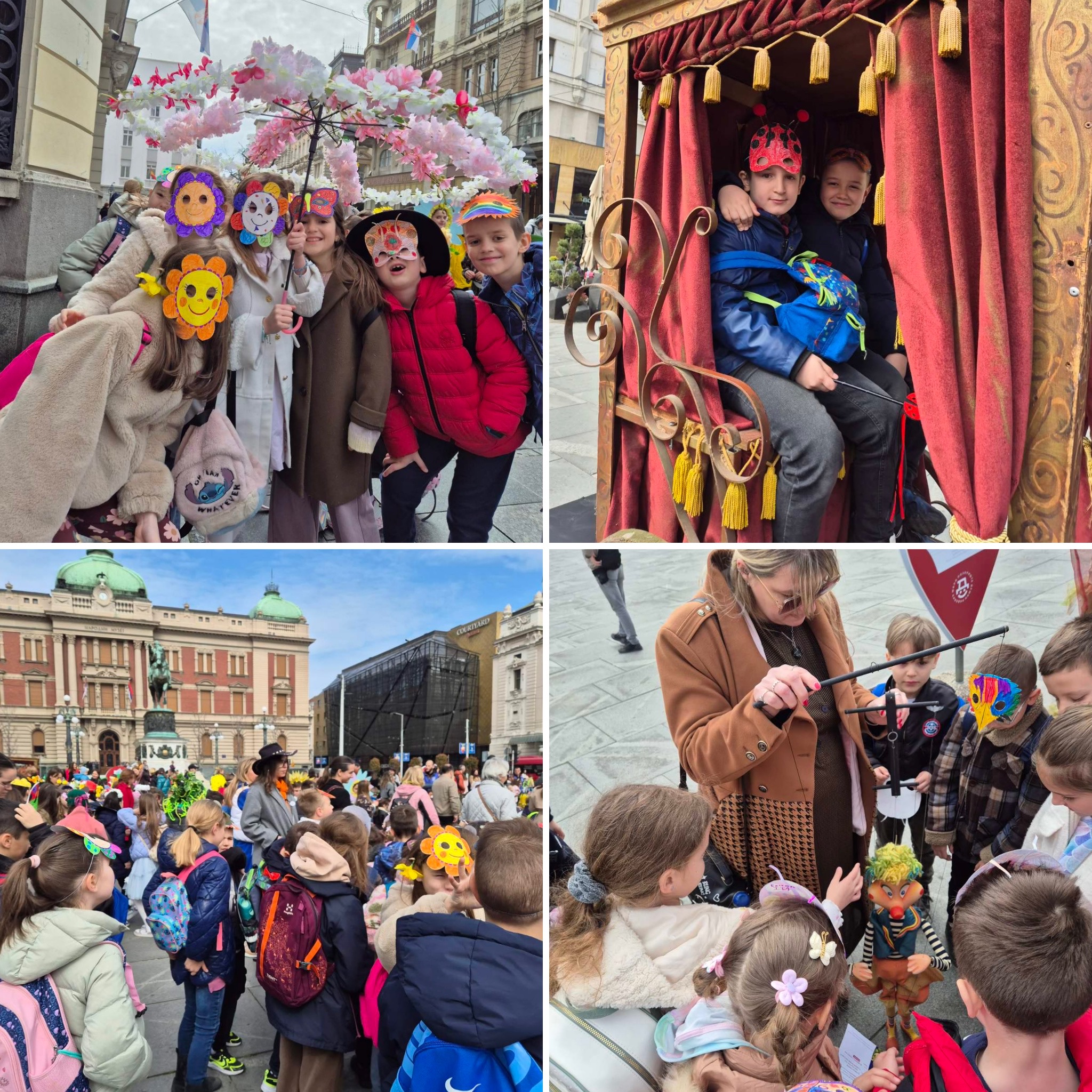 Карневалска шетња кренула је од САНУ-а до Трга Републике, где су ученике дочекала четири београдска дечја позоришта. Ученици су се маскирали, уживали у програму, на креативан начин обележили почетак пролећа и истовремено направили своје прве кораке у свет позоришне уметности.